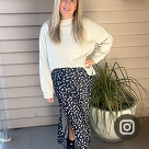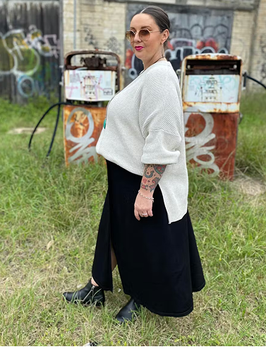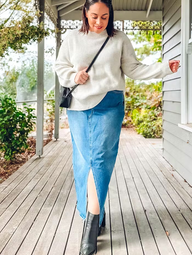 I adore this knit, it’s soft, cosy and very well constructed… I can tell it’s designed to last. The drop shoulders and split are lovely details. I generally wear a size AU14 and chose size L. It’s a generous, oversized fit so you could size down if you prefer a closer fitting knit.